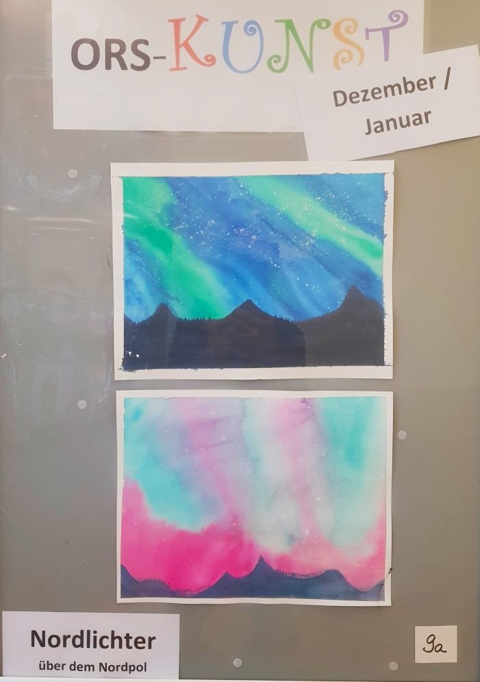 In unserer Kunst des Monats spielte dieses Mal auch der Zufall eine große Rolle! Auf dem feuchten Papier verliefen und vermischten sich die Farben so, dass sie an Nordlichter erinnern, wie sie in Polarregionen entstehen.